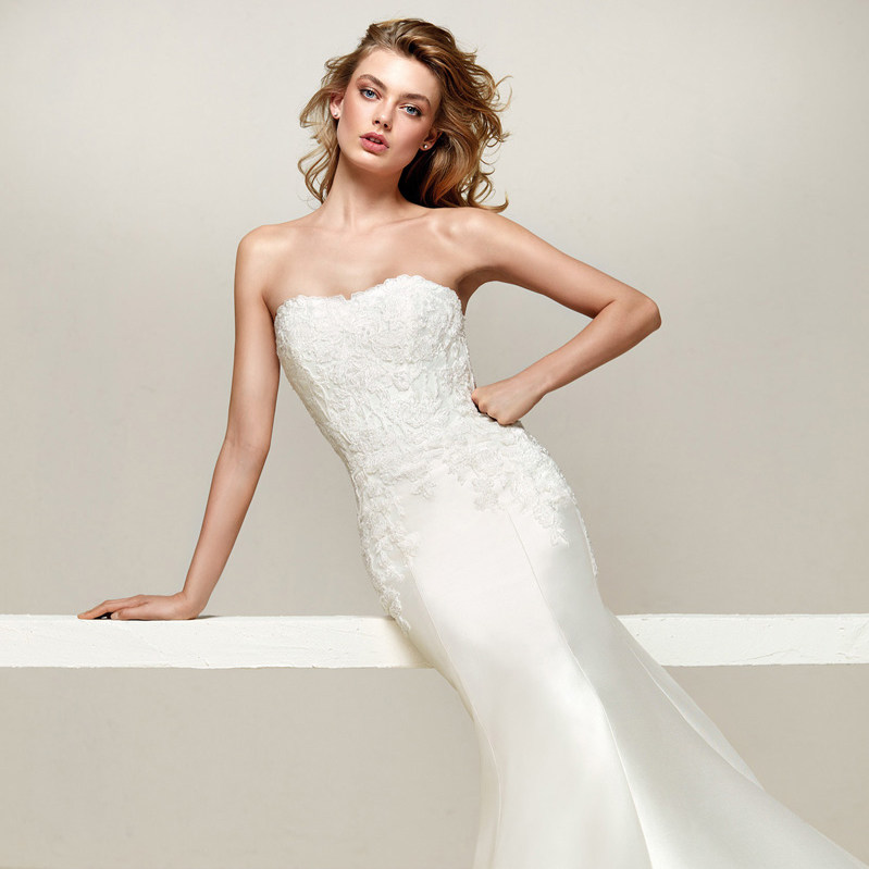 The detachable train allows for versatility, offering a dramatic effect for the ceremony and then easily removed for a more relaxed, practical fit for the reception or special occasions. This gown is perfect for brides who want to balance elegance with practicality.
