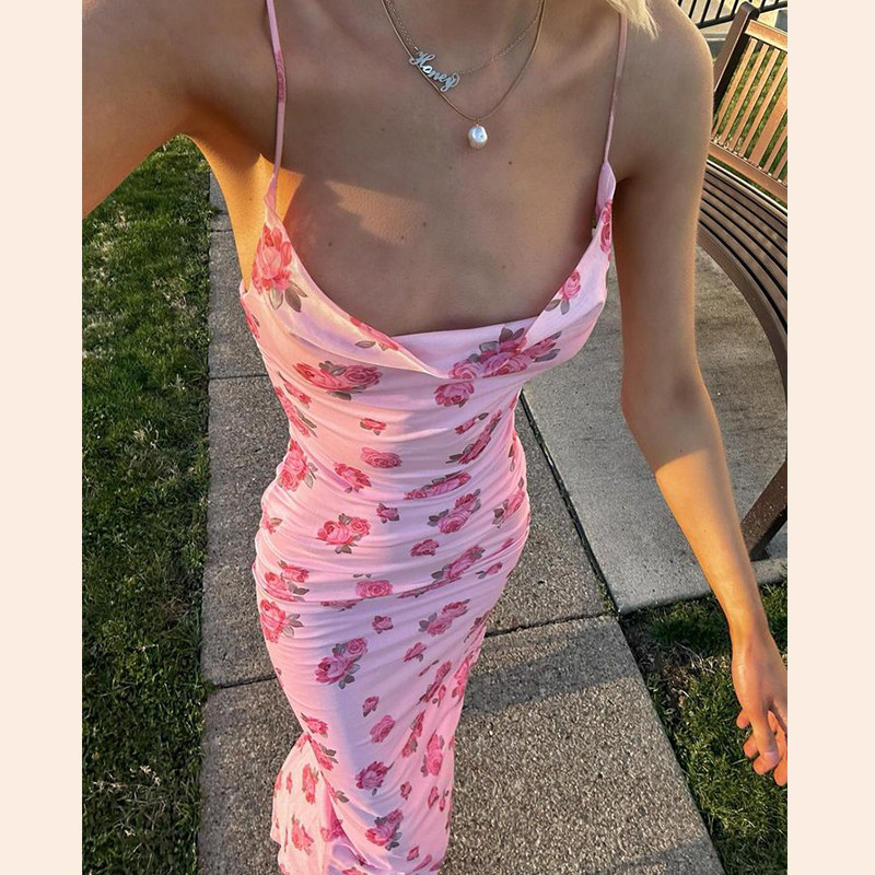 Xmsli | Printed Low-Cut Suspender Maxi Dress for Women, High-Waisted Backless Slim Fit Summer Wear